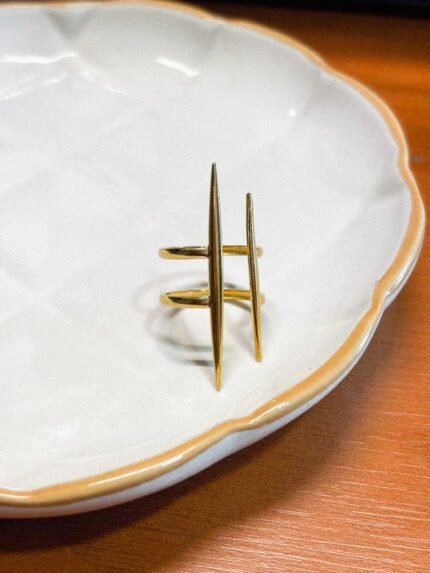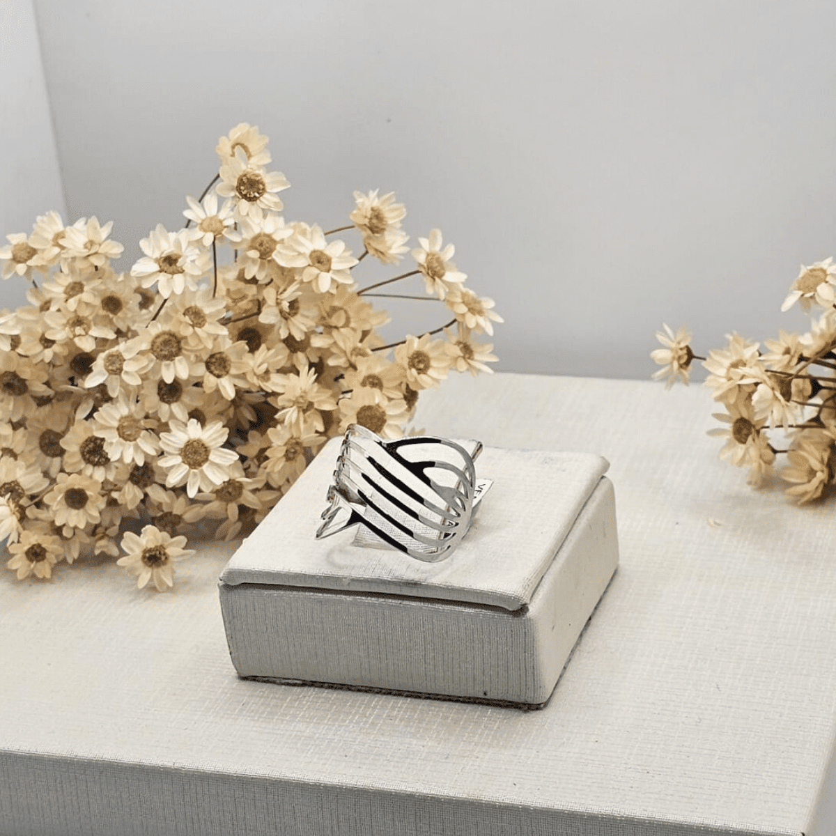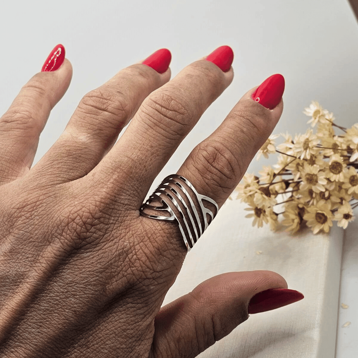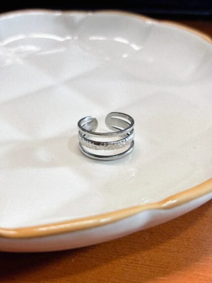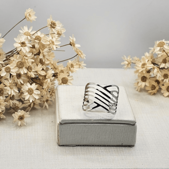 Anel em aço prateado com aro largo e design geométrico listrado em diagonais, com acabamento vazado que dá um visual moderno e elegante. Peça com brilho discreto, confortável para o uso diário e perfeita para destacar a mão, combinando fácil com looks casuais ou mais arrumados.