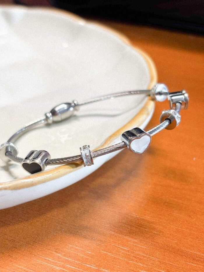 O bracelete de aço inox com corações e pedras brilhantes é perfeito para quem ama acessórios delicados com um toque de brilho. Com design romântico e moderno, ele traz detalhes em formato de coração e pedras com brilho que valorizam o pulso e deixam o look mais elegante no dia a dia ou em ocasiões especiais.