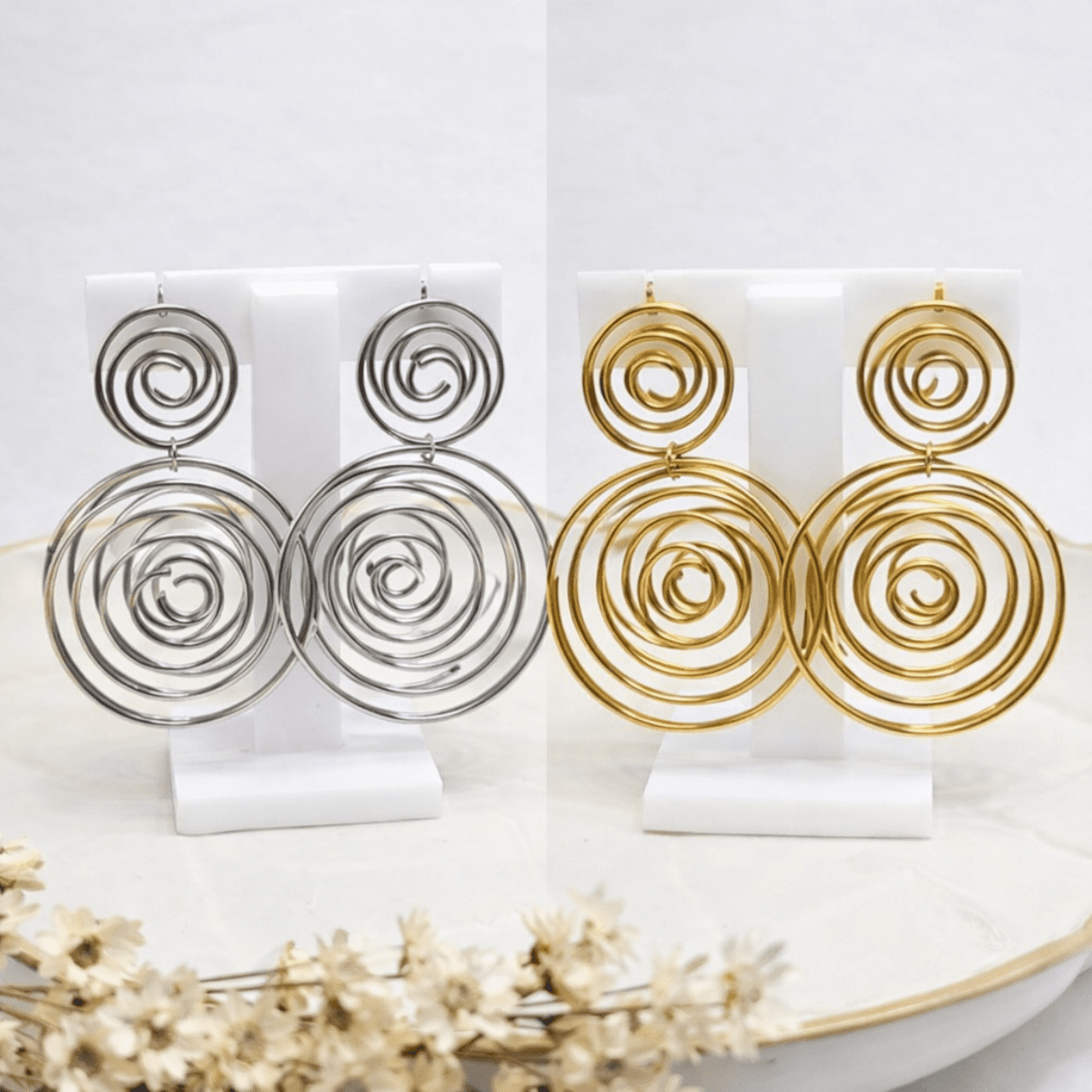 Brinco em aço inox com design de espiral dupla, moderno e elegante. Modelo pendente que destaca o visual e combina com produções do dia a dia e ocasiões especiais. Disponível nas cores dourado e prata (variação no anúncio).
