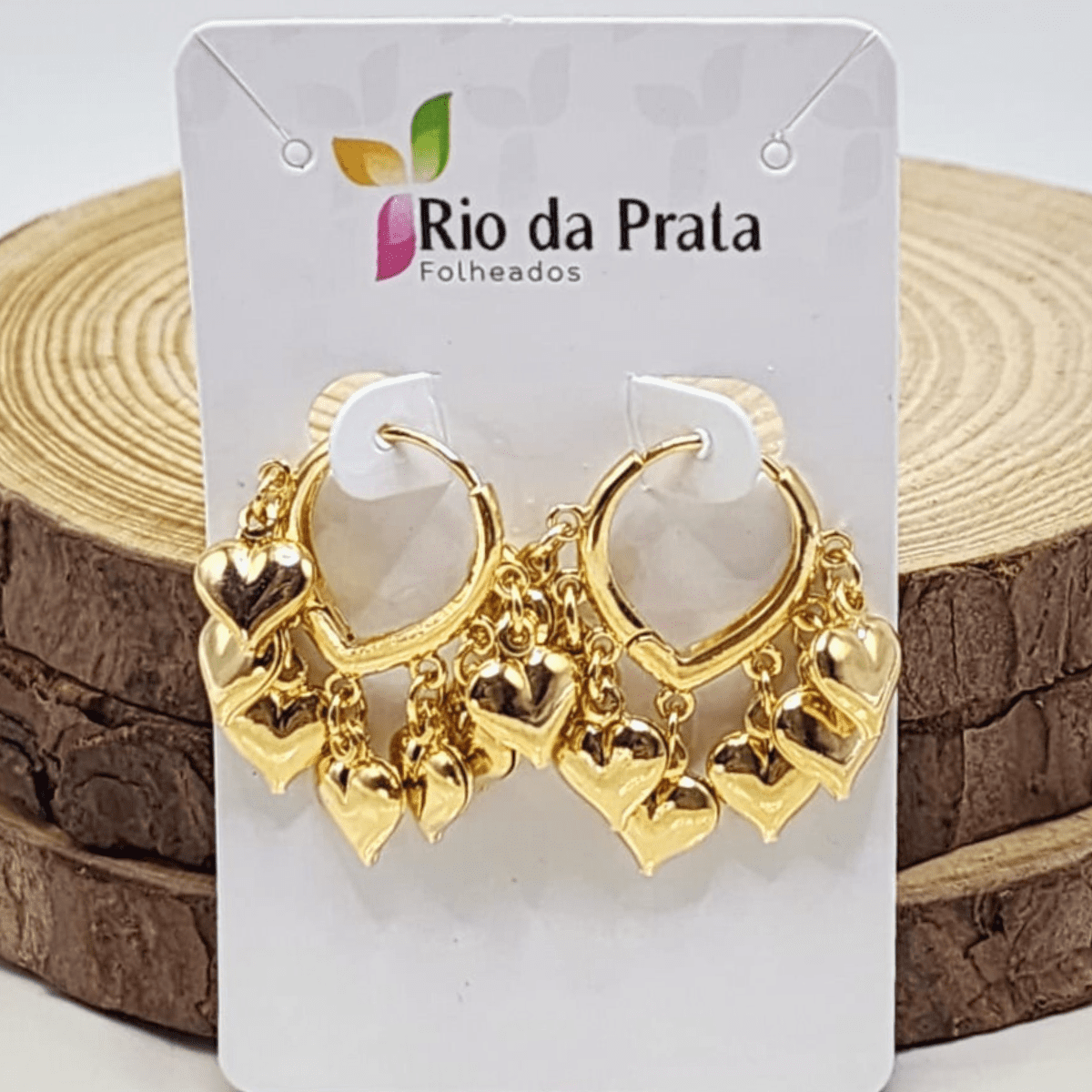 Brinco argola folheado a ouro com pingentes de coração que dão movimento e brilho ao look. Modelo moderno e delicado, perfeito para usar no dia a dia, em festas ou para presentear.