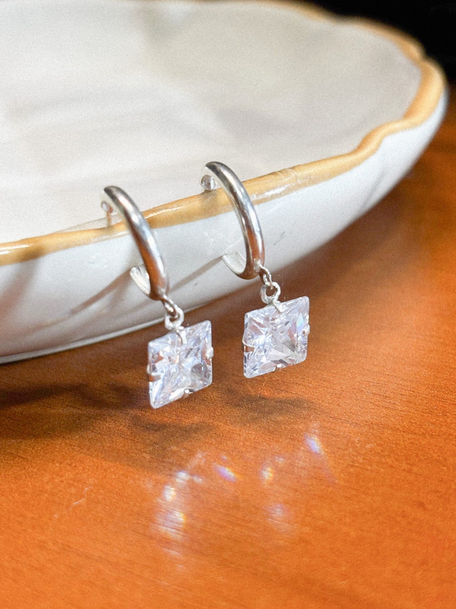 Brinco em Prata 925 com cristal quadrado pendurado, perfeito para quem busca um acessório elegante e delicado com brilho na medida certa. O modelo combina argolinha pequena com pingente de pedra quadrada transparente, trazendo um visual moderno e sofisticado. Ideal para usar no dia a dia, em eventos ou para presentear, pois combina facilmente com outros brincos e colares.