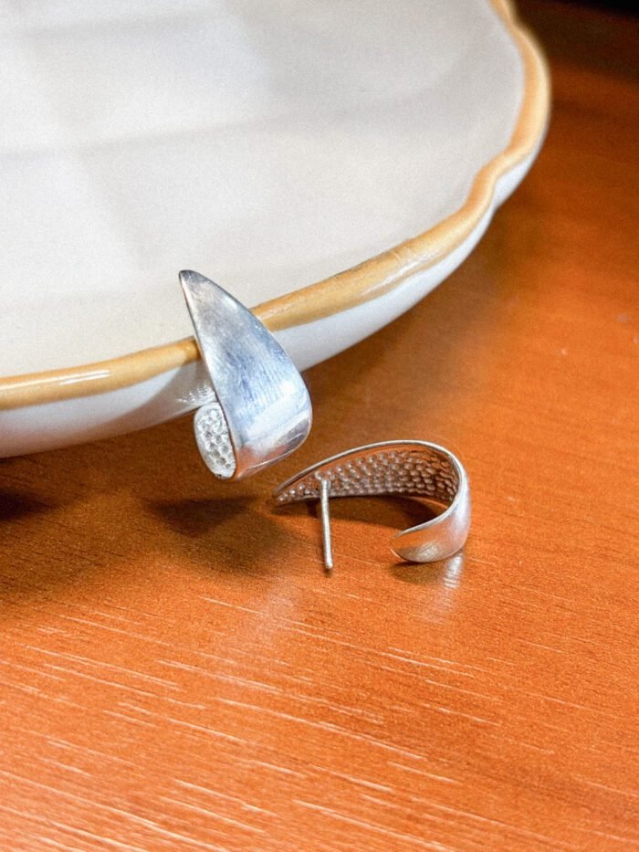 Brinco elegante folheado a prata, com design moderno em formato curvo e fundo/verso detalhado (texturizado), trazendo um acabamento diferenciado e sofisticado. Uma peça perfeita para quem gosta de acessórios contemporâneos, com brilho discreto e presença na medida certa — ideal para usar no dia a dia ou em ocasiões especiais.