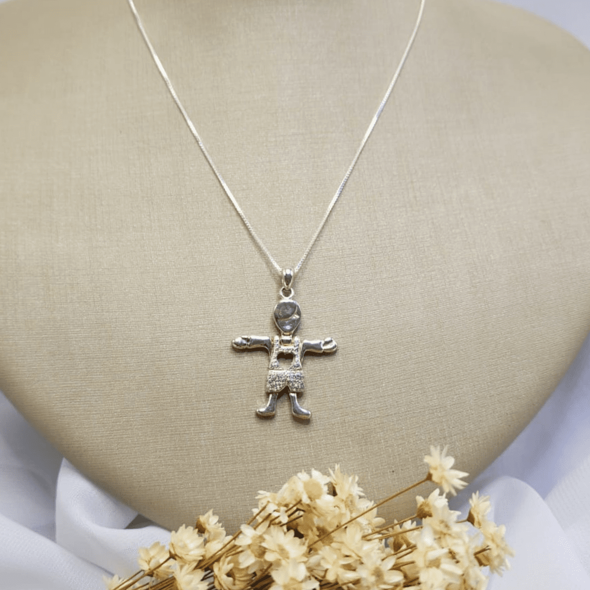 Colar folheado a prata com pingente de menino em alto-relevo e detalhes cravejados que dão um brilho delicado e elegante. Uma peça com toque afetivo e moderno, perfeita para representar amor, família e momentos especiais.