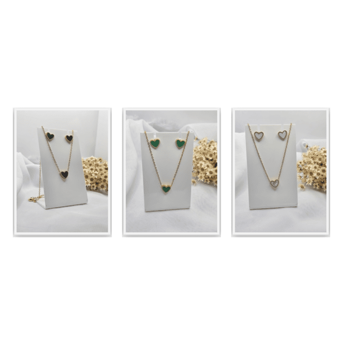 Conjunto Colar + Brincos Coração em Aço Inox – Variações Preto, Branco e Verde