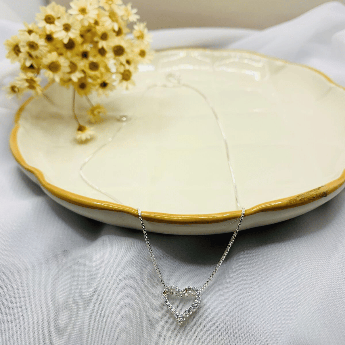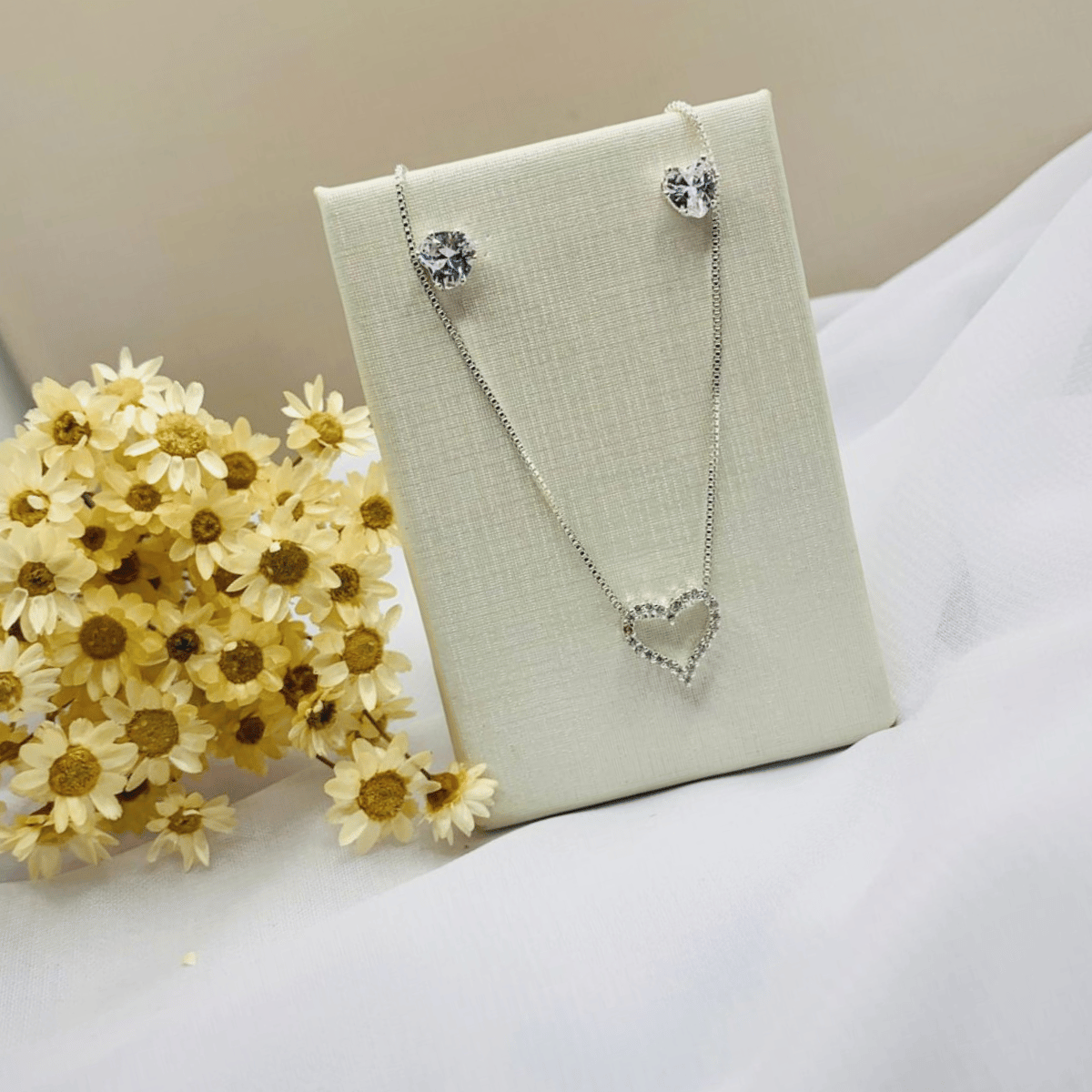 Transforme seu visual com esse conjunto feminino folheado de alto brilho, composto por um colar delicado com pingente de coração cravejado e um par de brincos ponto de luz, perfeitos para quem ama acessórios com estilo e leveza.