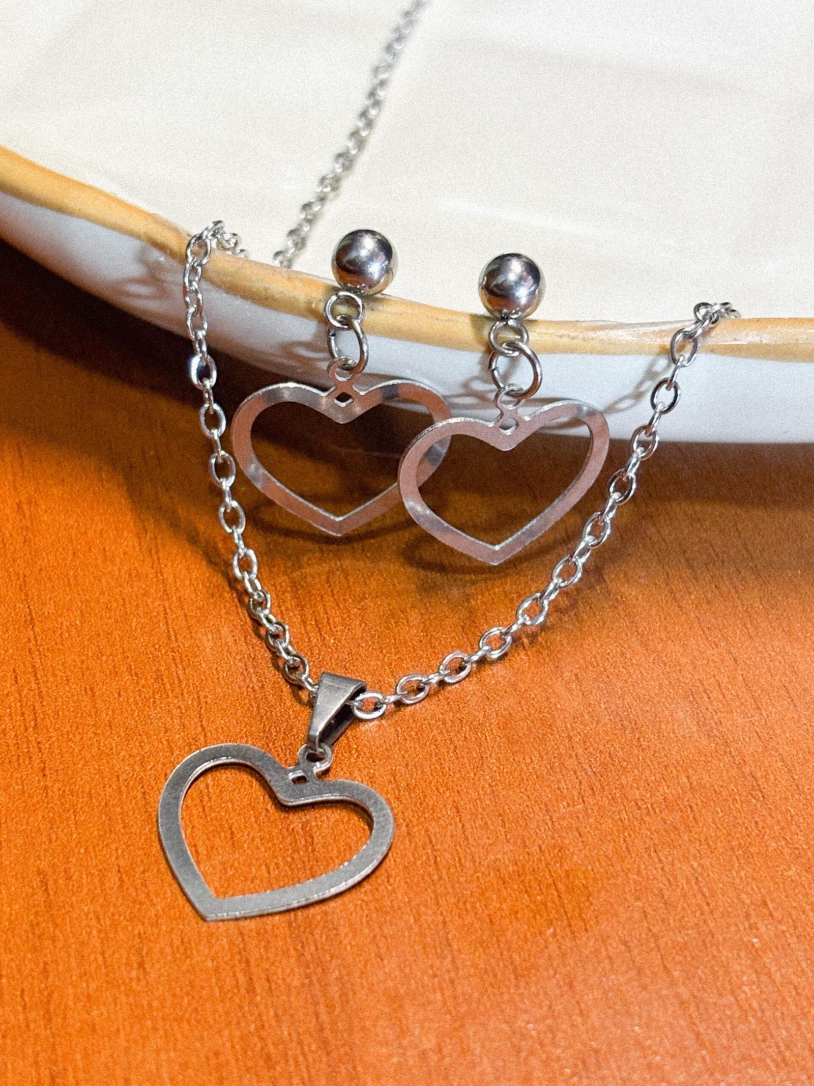 Conjunto moderno e delicado em aço inox, composto por colar e brincos com coração vazado, perfeito para quem gosta de acessórios minimalistas e cheios de estilo. O design vazado traz leveza e um visual romântico, enquanto o aço inox oferece mais resistência e durabilidade para o uso no dia a dia.