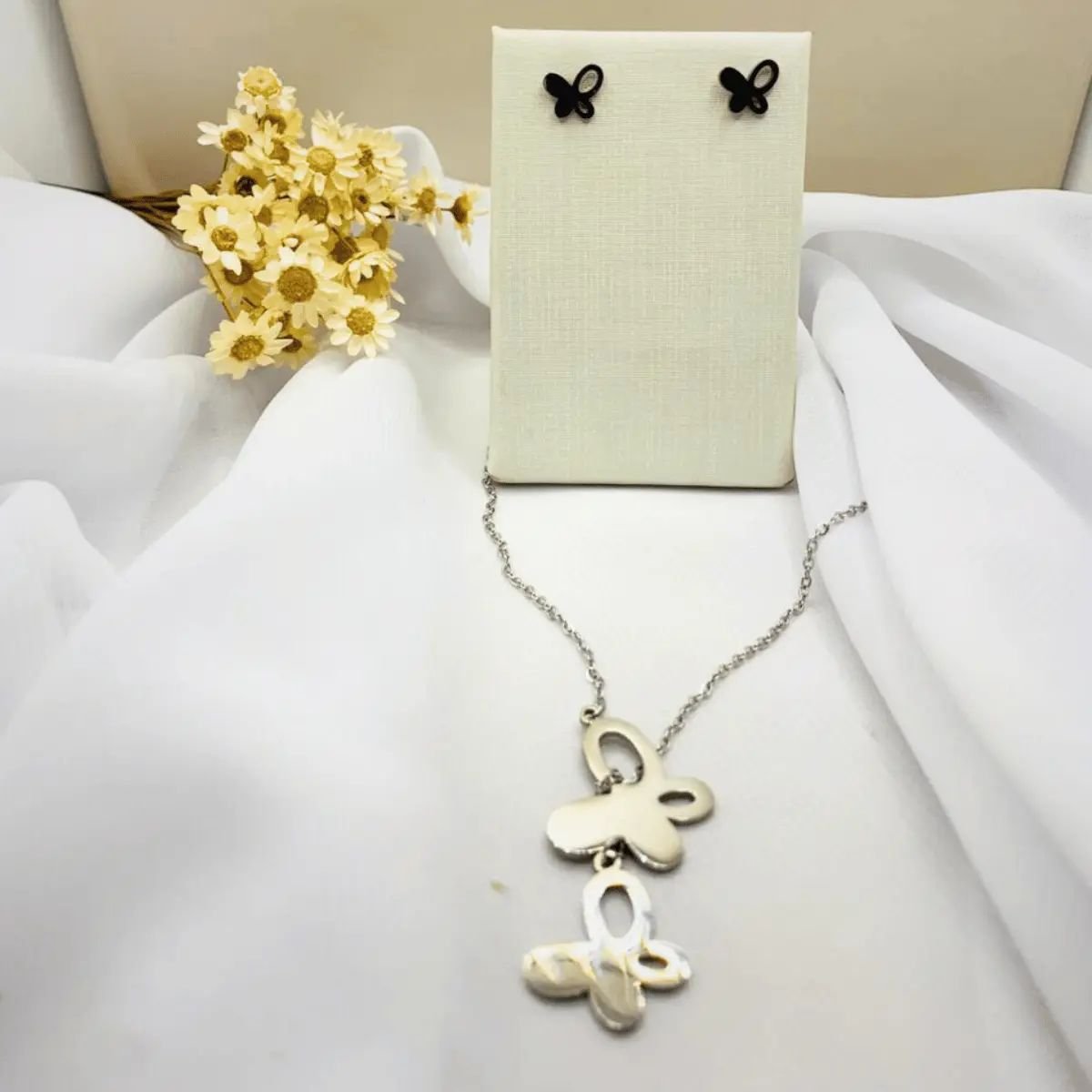 Conjunto Feminino em Aço Inoxidável – Colar com Duas Borboletas + Brincos Borboleta