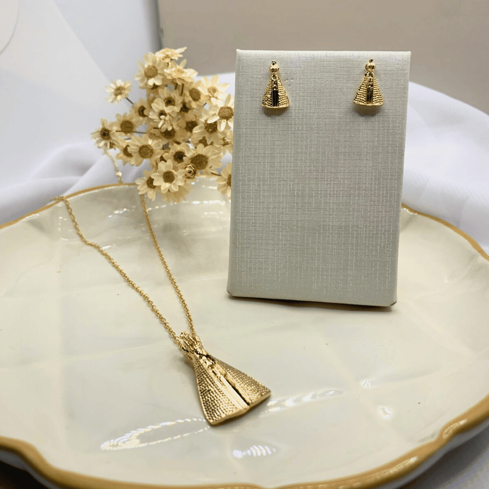 Expresse sua fé com elegância usando este conjunto religioso feminino, composto por um colar e um par de brincos com pingentes delicados de Nossa Senhora Aparecida, símbolo de proteção e devoção.