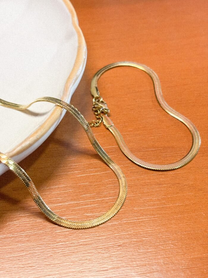 Conjunto composto por colar e pulseira em fita dourada, feito em aço, com acabamento brilhante e visual elegante. A malha tipo fita oferece ótimo caimento e conforto, ideal para usar no dia a dia ou em ocasiões especiais. Um acessório versátil para combinar com qualquer look.