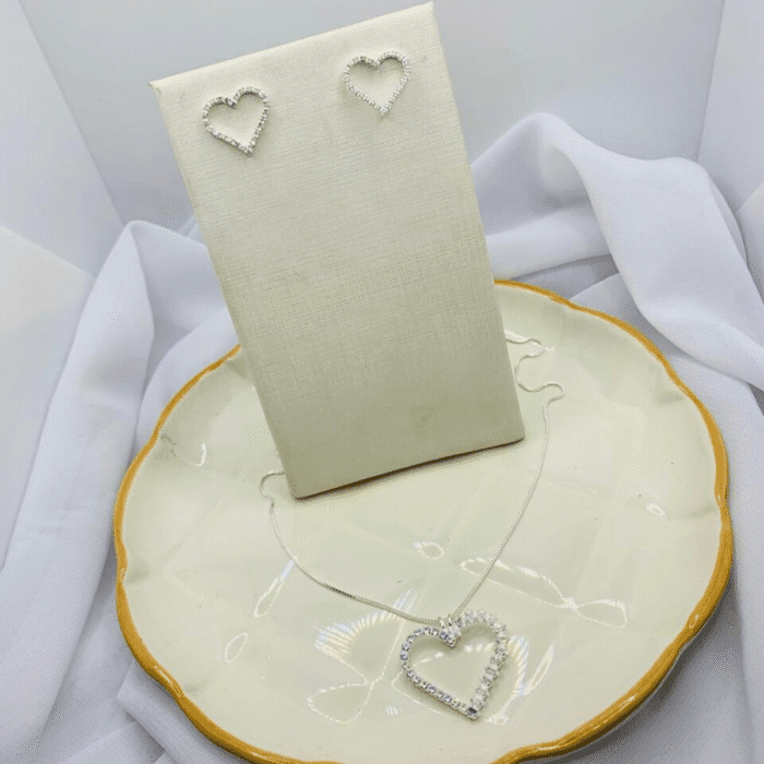 Um toque de amor e brilho para o seu visual! Este conjunto folheado a prata traz o equilíbrio perfeito entre delicadeza e sofisticação. Composto por um colar com pingente em formato de coração cravejado e um par de brincos combinando, é ideal para mulheres que amam acessórios com estilo e significado.