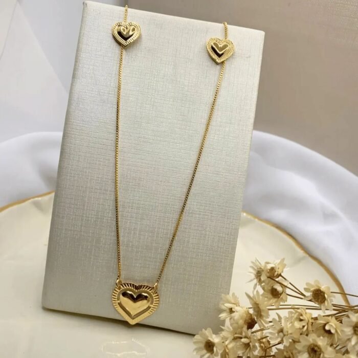 Conjunto Luxo Folheado Feminino – Colar e Brincos com Coração Duplo em Relevo