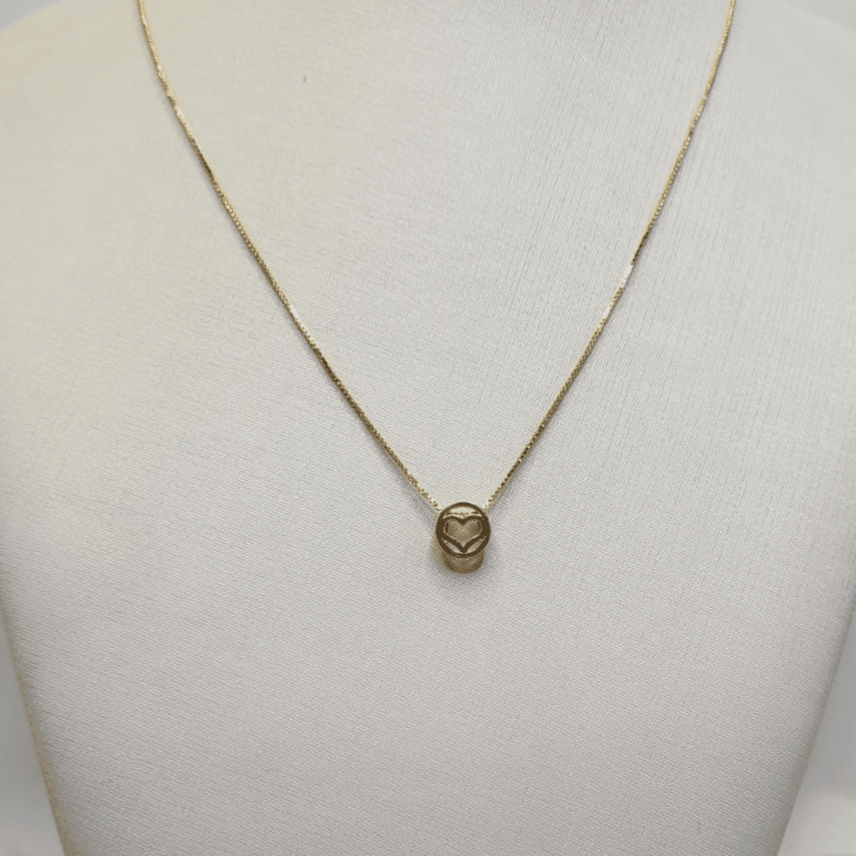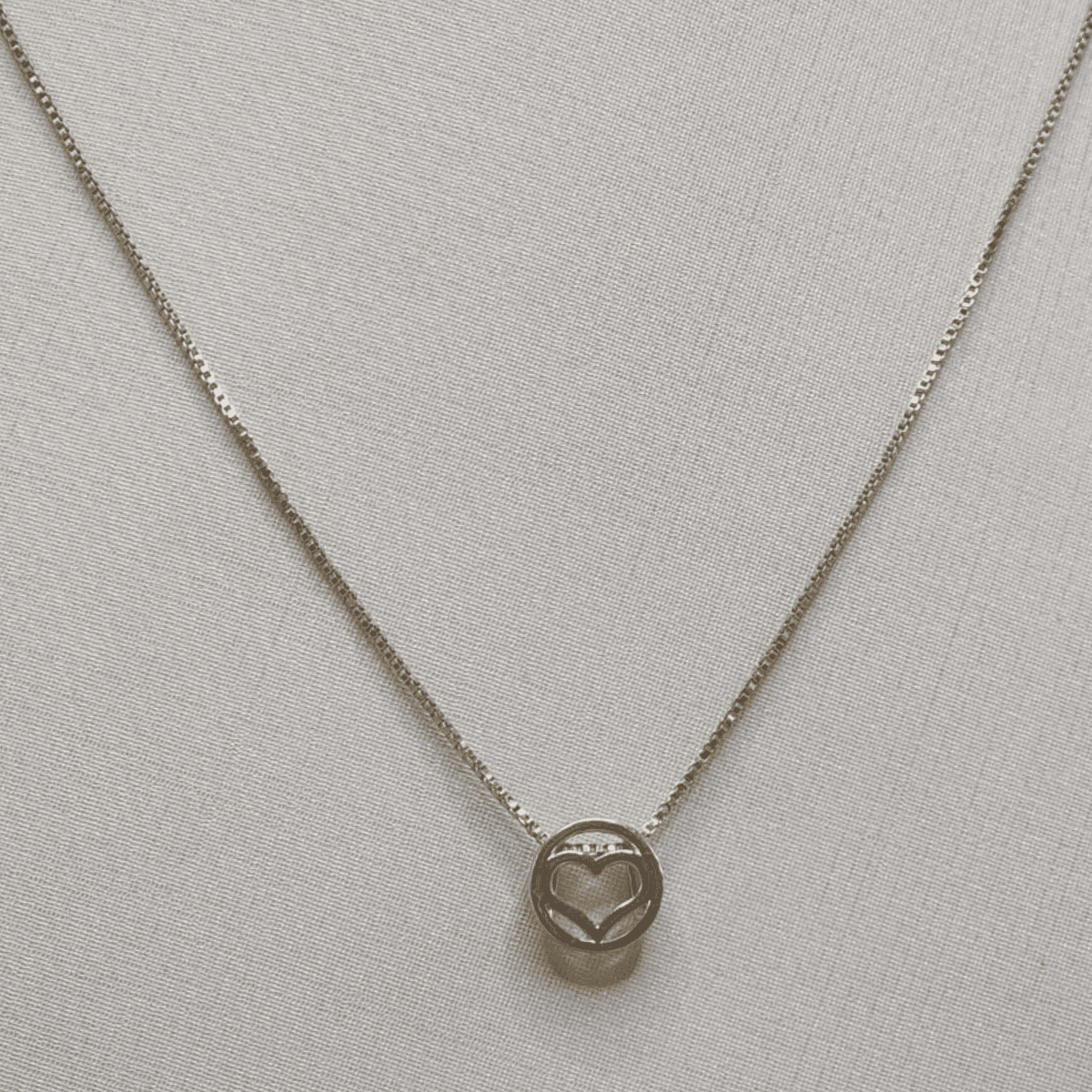 Cordão folheado a ouro com pingente delicado em formato de medalha redonda com coração vazado ao centro. Modelo minimalista e versátil, perfeito para usar sozinho ou em mix de colares, combinando com looks do dia a dia e ocasiões especiais.