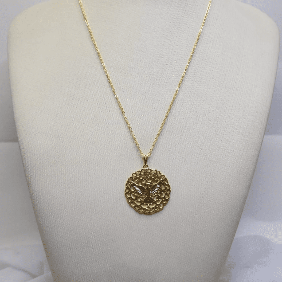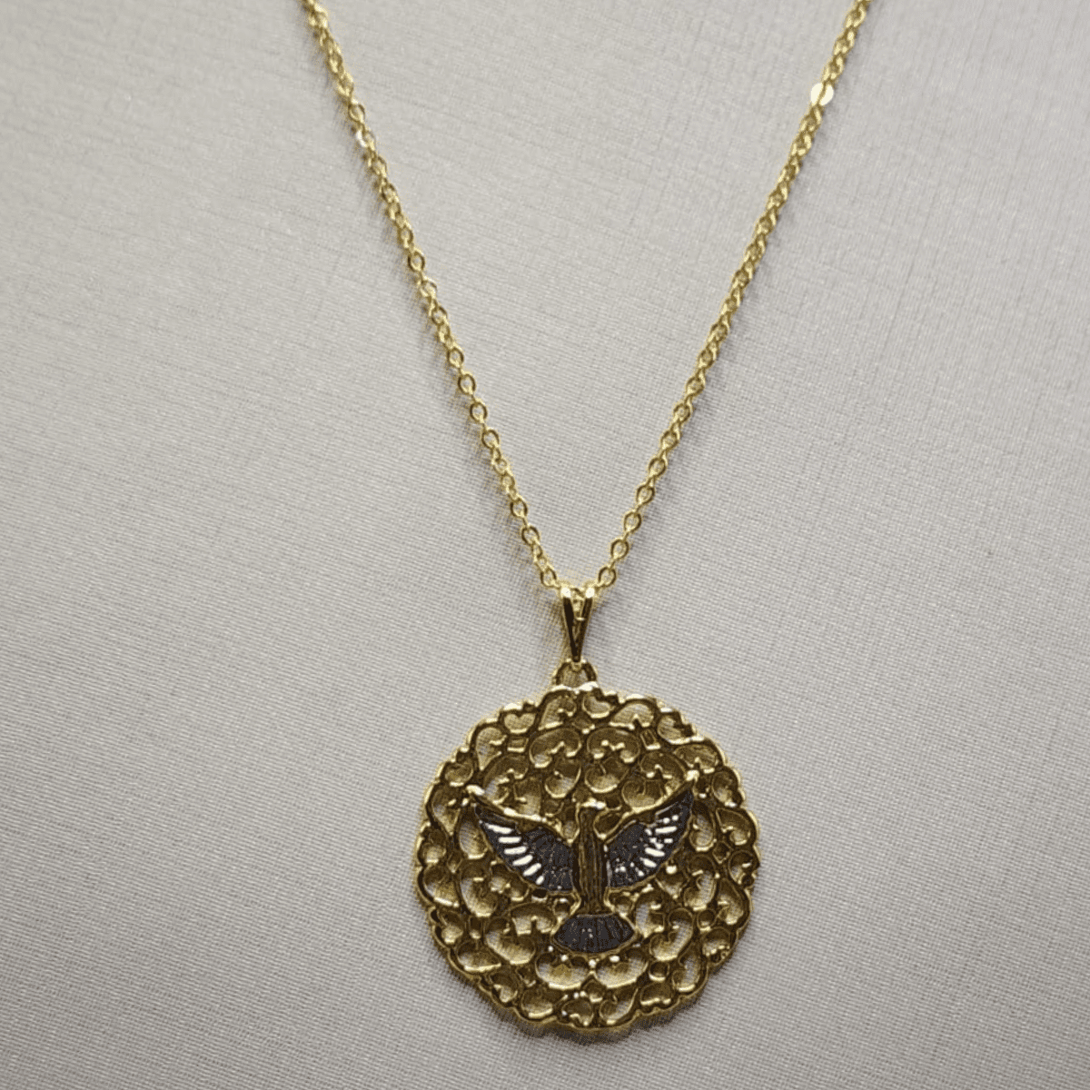 Cordão folheado a ouro com pingente em formato de medalha redonda trabalhada, com símbolo do Divino Espírito Santo em destaque. Peça elegante e significativa, ideal para uso diário, ocasiões especiais e para presentear.