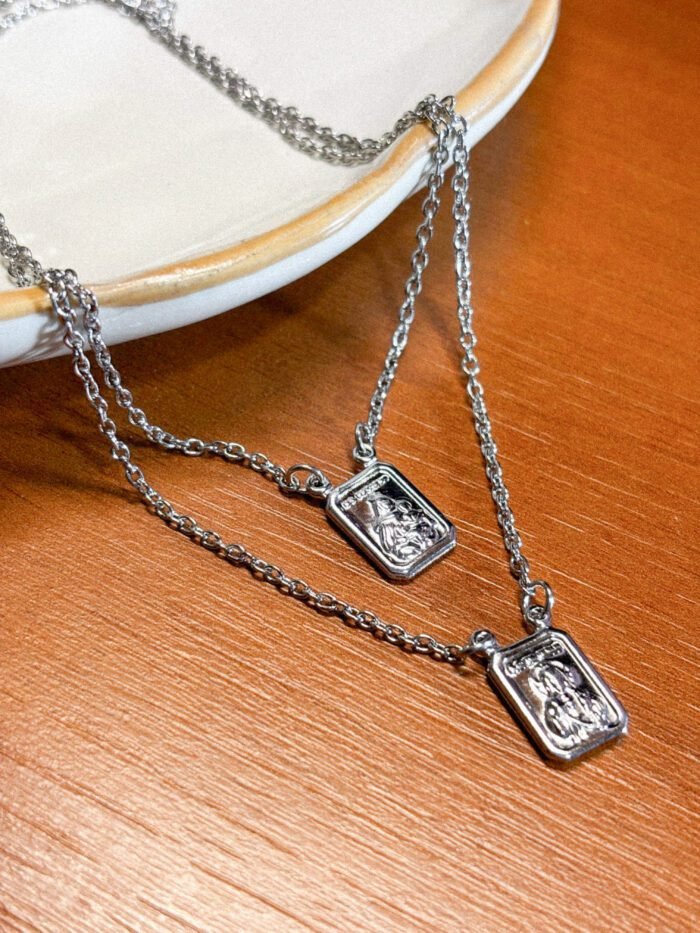 Escapulário medalhinha tradicional com visual clássico e discreto, ideal para quem busca um acessório de fé para usar no dia a dia. Possui duas medalhinhas retangulares em alto/baixo relevo, com acabamento prateado e corrente dupla, garantindo um caimento elegante e um estilo atemporal. Produzido em aço inoxidável, é uma ótima opção para quem quer durabilidade e praticidade.