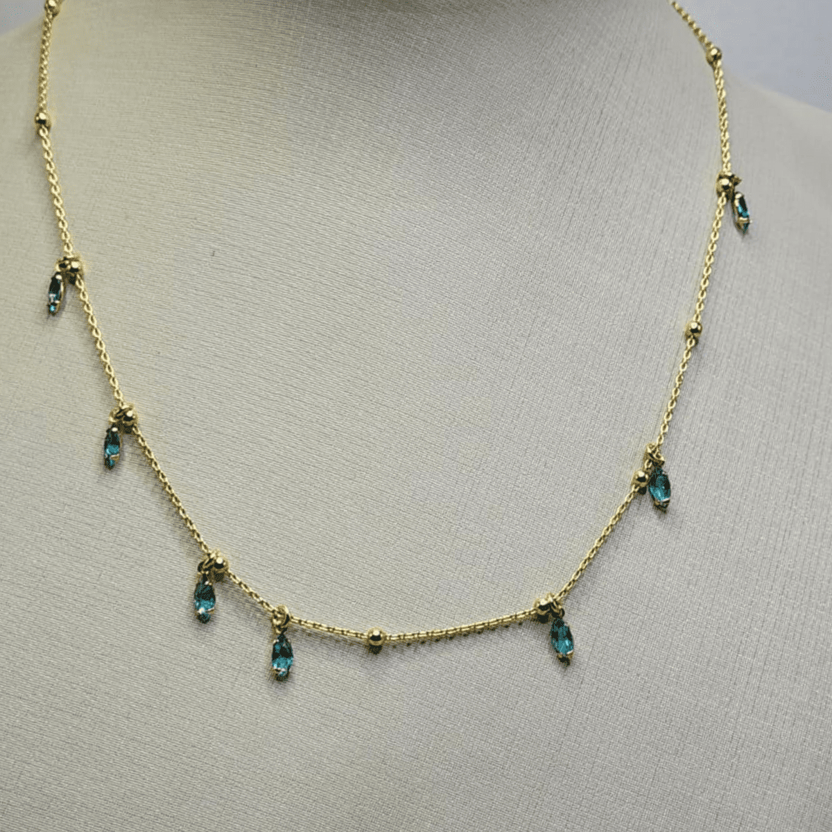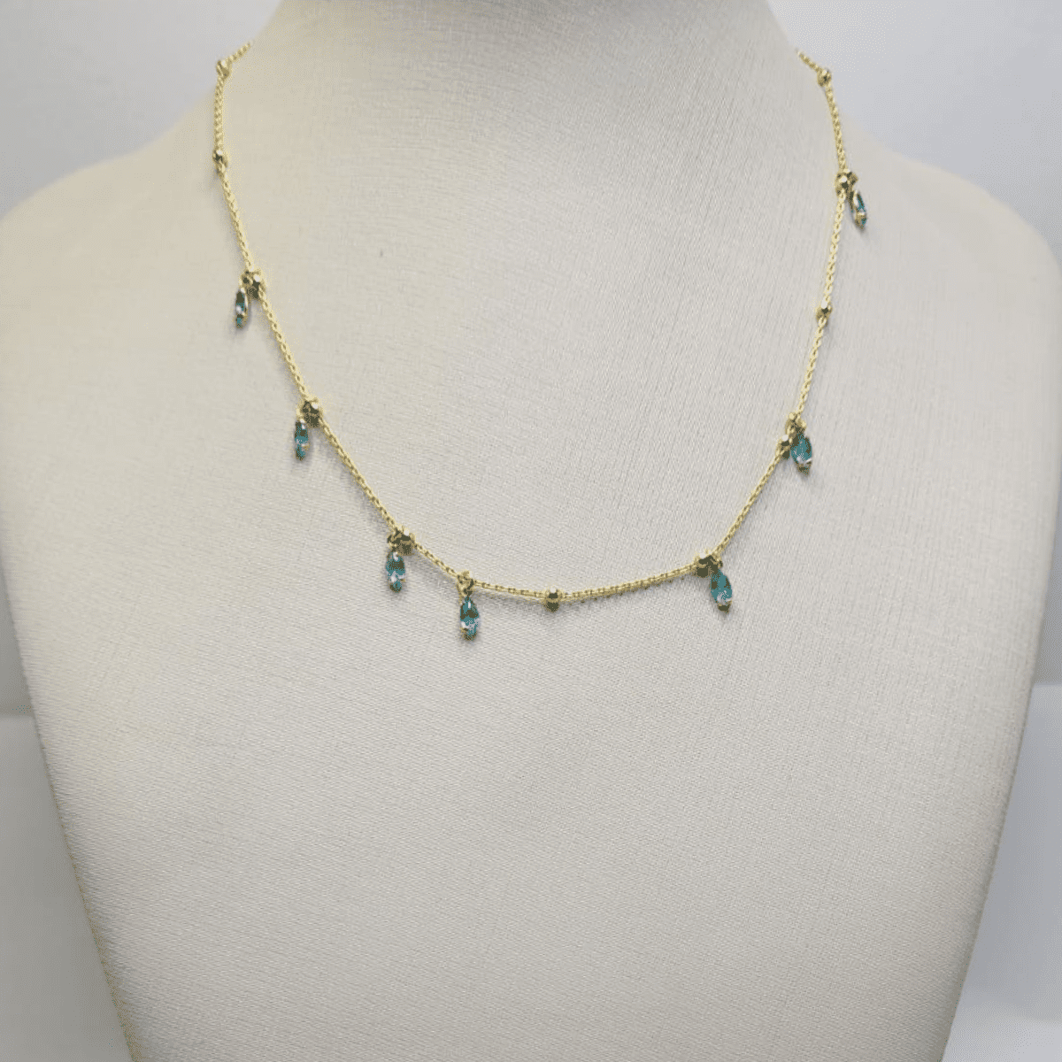 Gargantilha folheada a ouro com pequenos pingentes em formato de gota na cor azul, distribuídos ao longo da corrente. Modelo delicado, leve e elegante, perfeito para valorizar o colo e compor looks do dia a dia ou ocasiões especiais.
