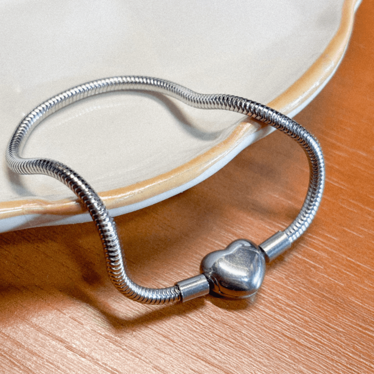 A pulseira estilo Pandora com fecho coração é perfeita para montar combinações com charms/berloques e criar um acessório único. Com design clássico e elegante, ela possui fecho em formato de coração, trazendo um toque delicado e sofisticado para o dia a dia.