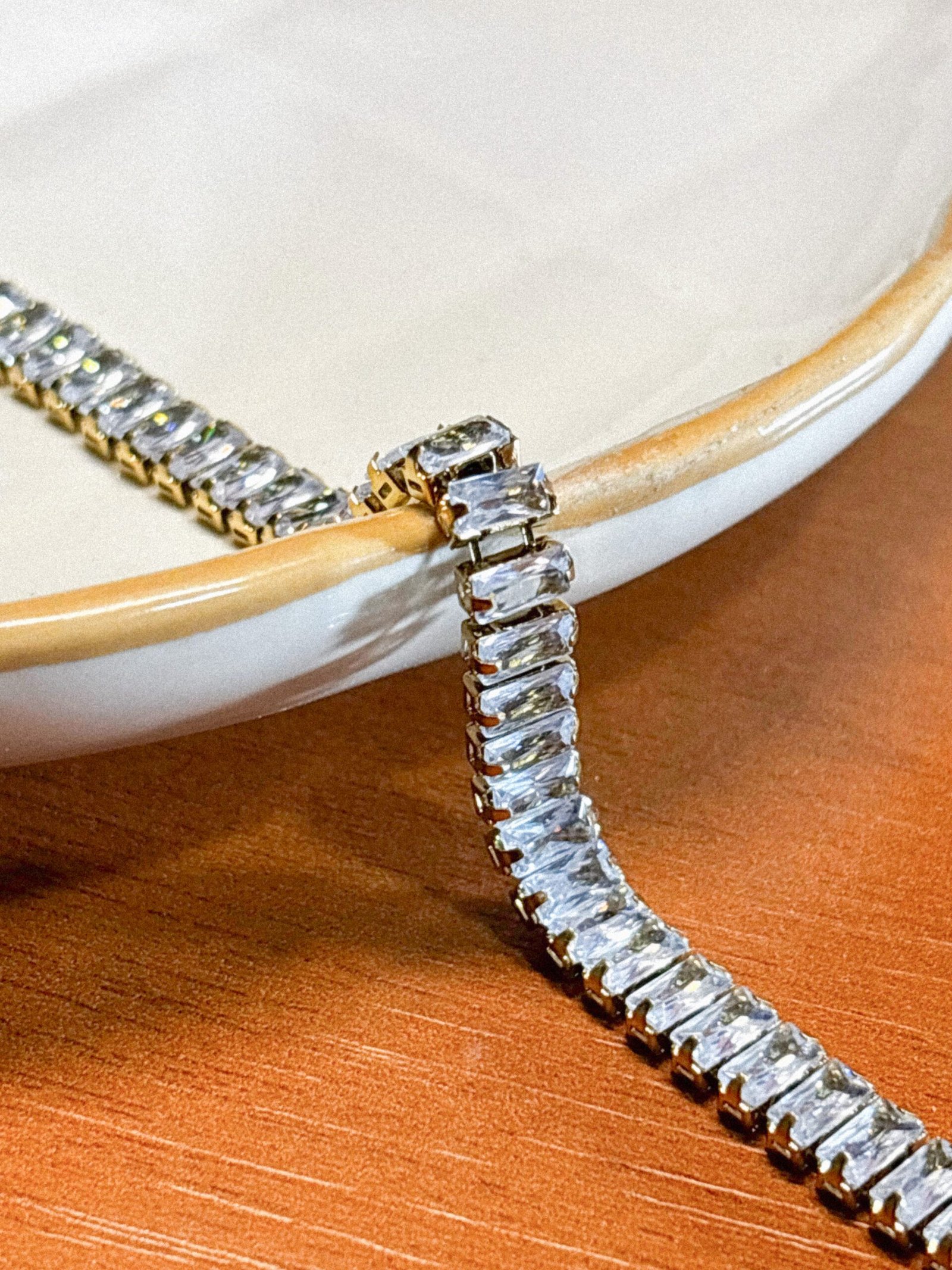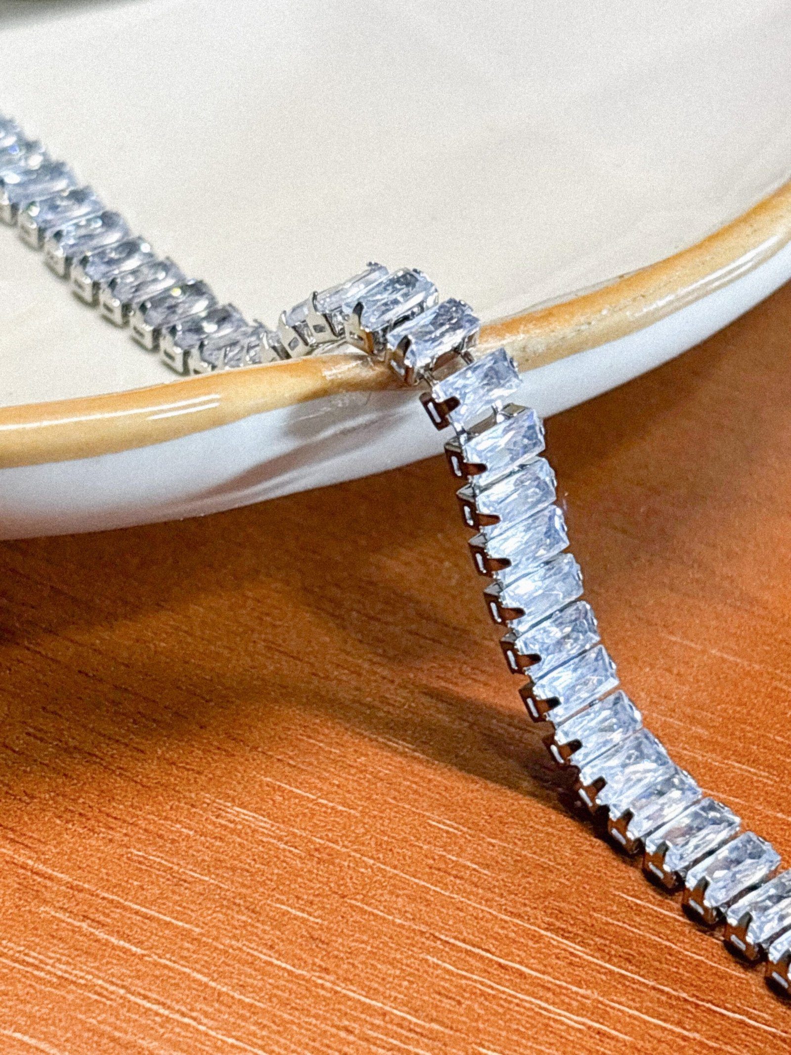 A pulseira de aço inox com retângulos cravejados é perfeita para quem ama acessórios com brilho e acabamento sofisticado. Seu design é composto por retângulos com pedras cravejadas, criando um efeito elegante e moderno que valoriza o pulso e combina com produções do dia a dia ou ocasiões especiais.